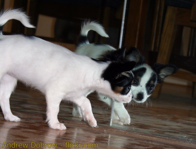 Co robi pies, widząc pierwszy raz w życiu swoje odbicie w lustrze? Zazwyczaj zastyga bez ruchu, przypatruje się i… Próbuje przywitać się z tym fajnym psiakiem. Ponawia takie próby kilkakrotnie, aż w końcu uzna, że ten drugi nie ma zapachu, jest płaski i zimny, więc nie warto się nim zajmować. Z wiekiem psy zaczynają ignorować swoje odbicie w lustrze, nauczone doświadczeniem: ten dziwak po drugiej stronie ani mi nie zagraża, ani nie będzie się ze mną bawił. Nie warto się nim przejmować.